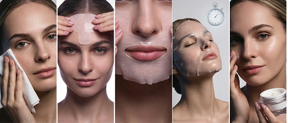 - Начните с очищения кожи: удалите макияж и загрязнения, затем аккуратно промокните лицо салфеткой. Поверхность должна быть сухой, иначе гидрогелевая основа не сможет надежно зафиксироваться.