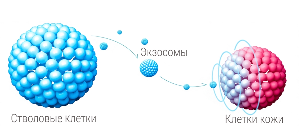 Когда экзосомы входят в состав косметических продуктов, они начинают воздействовать на клетки, передавая им различные сигналы и активируя несколько процессов одновременно.