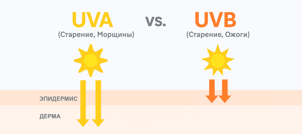 Дерматологи рассматривают 2 типа ультрафиолетового излучения, различающиеся по длине волны и воздействию на кожу: